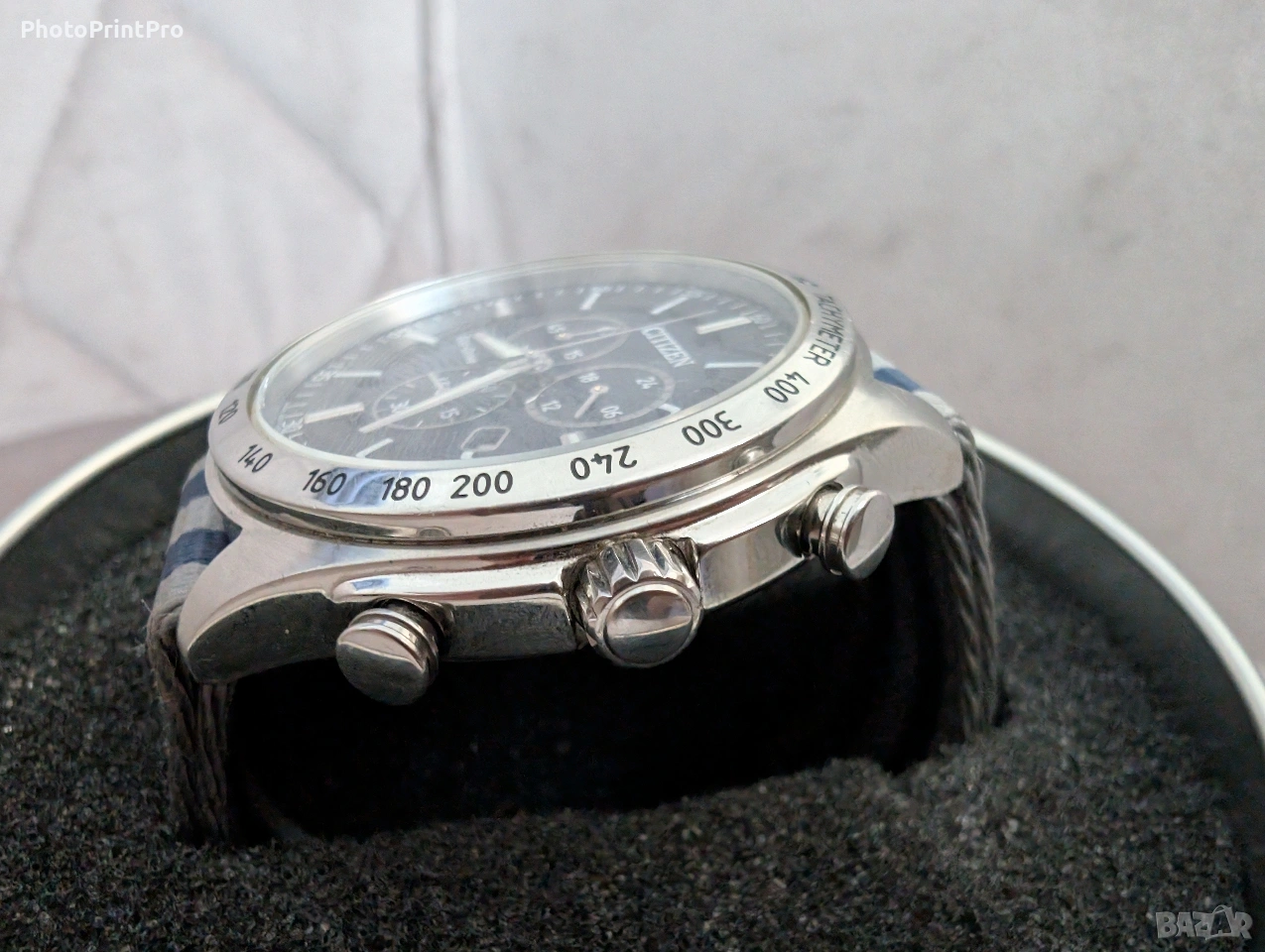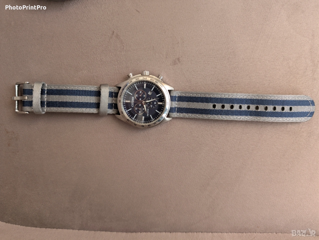 Продавам мъжки часовник Citizen, модел от серията Brycen/Sport. Изключително надежден и стилен аксесоар, подходящ както за ежедневието, така и за по-спортни активности. Основни характеристики: Механизъм: Соларен (Eco-Drive) – зарежда се от всякакъв вид светлина (естествена или изкуствена). Никога няма нужда от смяна на батерия! Калибър: H500 (японски кварцов механизъм с висока точност). Корпус: Благородна стомана (Stainless Steel) с матирани и полирани елементи. Циферблат: Тъмносин/черен с текстура, фосфоресциращи стрелки и индекси за отлична видимост нощем. Функции: Хронограф (секундомер) 24-часов индикатор Дата на 4 часа Тахиметрична скала на безела (за измерване на скорост) Каишка: Висококачествена текстилна каишка тип „NATO“ в сиво и синьо райе, която придава модерен военен/спортен стил и е изключително удобна за носене. Водоустойчивост: 100 метра (10 Bar) – подходящ за плуване. Състояние: Часовникът е използван, но е в много добро визуално и отлично техническо състояние. Стъклото и корпусът имат минимални следи от употреба, нормални за носен часовник (видими на снимките). Механизмът работи безупречно и държи заряд перфектно.