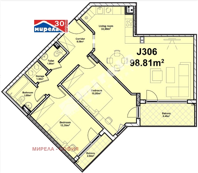 Апартаментът Ж306, който представям с тази оферта е със следното разпределение: коридор, дневна с трапезария и кухненски бокс, две спални, баня с тоалетна, тоалетна, склад и два балкона.
