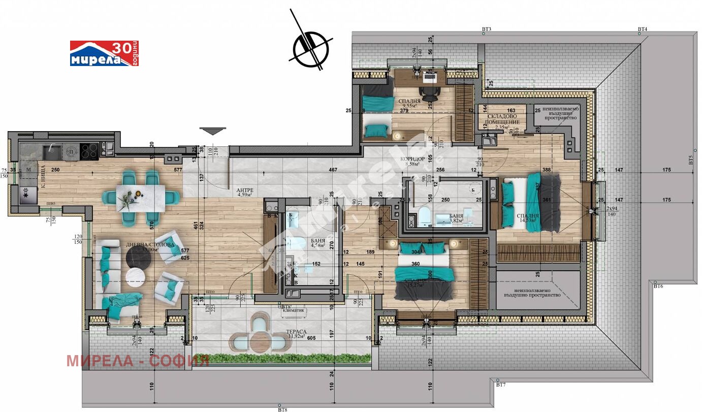 С тази оферта представям 4-СТАЕН апартамент със следното разпределение: антре, дневна с кухненски бокс, три спални, две бани с тоалетна и тераса.