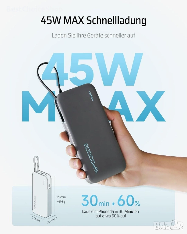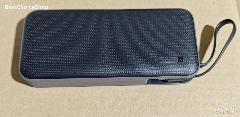 - С огромен капацитет от 20 000 mAh, това преносимо зарядно устройство е проектирано да осигурява множество зареждания без усилие. То може да зареди вашия iPhone 15 до 4,1 пъти, вашия Samsung Galaxy S24 Ultra около 2,9 пъти и вашия iPad Air приблизително 1,9 пъти.