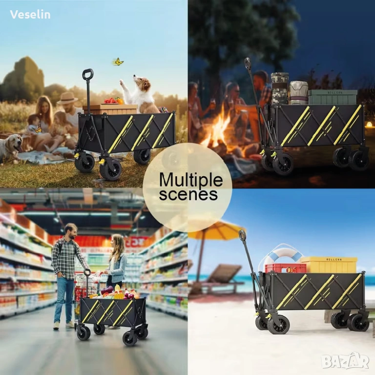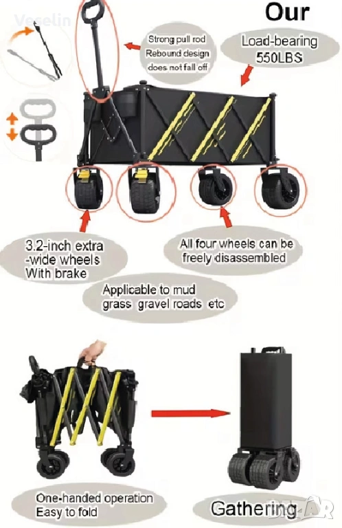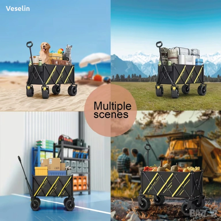Тежкотоварна, универсална, сгъваема, транспортна количка до 250 kg. Подходяща за пазаруване, къмпинг, плаж, градина, транспорт на спортно оборудване и др. Въртящи се на 360° предни колела, с механични спирачки. Компактно и бързо събиране за транспортиране и съхранение.