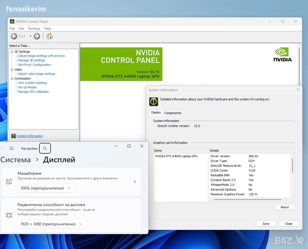 2 видеокарти : Nvidia RTX А4000 256bit 8GB DDR6 собствена памет + Intel UHD Video - up to 24 GB Total Graphics memory.