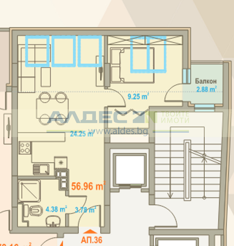 РАЗПРЕДЕЛЕНИЕ: входно антре, дневна с бокс, сапланя с балкон, баня и тоалетна.