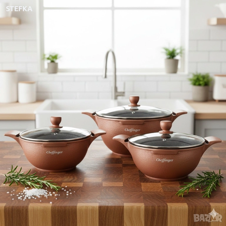 Комплект от 3 тенджери Cheffinger с мраморно покритие 20/24/28 см с капаци – незалепващи съдове за всички видове котлони