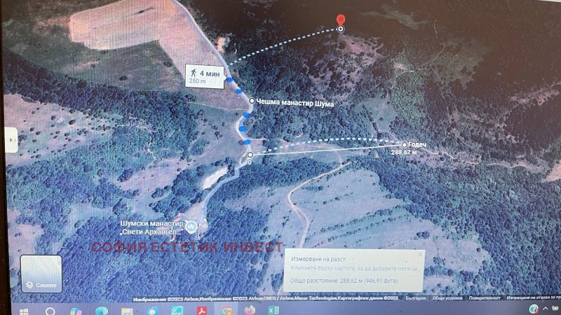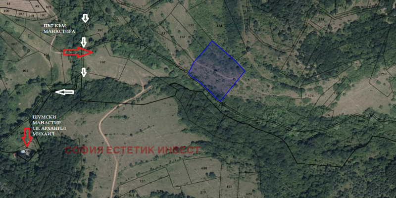 Имот с квадратна форма - изключителна рядкост при земеделските поземлен имот, които обикновенно са с много тънка правоъгълна форма и ограничават ползвателя/инвеститора. В района на Шумския манастир 'Св.Архангел Михайл', тангентира с река. Виж кадастрален номер 83466.5.397. Кристално чист въздух, тишина и спокойствие в близост до Столицата.