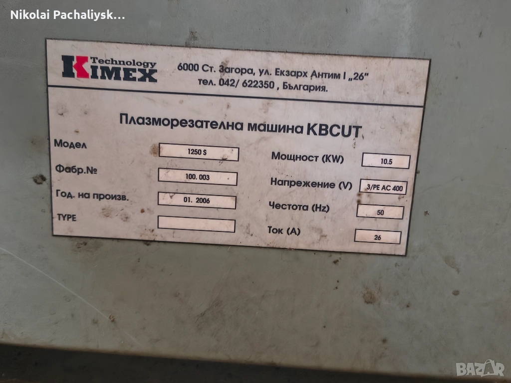 Машината е производство на Kimex , гр. Стара Загора. Токоизточникът е Hypertherm powermax 1250 G3. Максимален размер на листа ламарина , който се обработва е (2000х1250) мм. Продава се с компютъра.