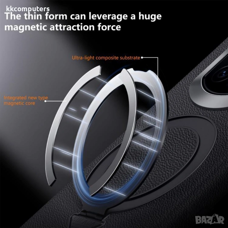 Магнитен държач за безръка използване: Умният дизайн включва силен вграден магнит, който ви позволява да закачите телефона лесно към всяка магнитна повърхност. Перфектен за гледане на филми, видеоразговори или следене на рецепти на кухнята, оставяйки ръцете ви свободни.