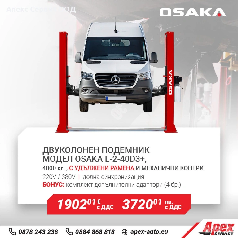 Двуколонен подемник с долна синхронизация модел OSAKA L-2-40D3+, 4000 кг. мех.контри,удълженени лапи
