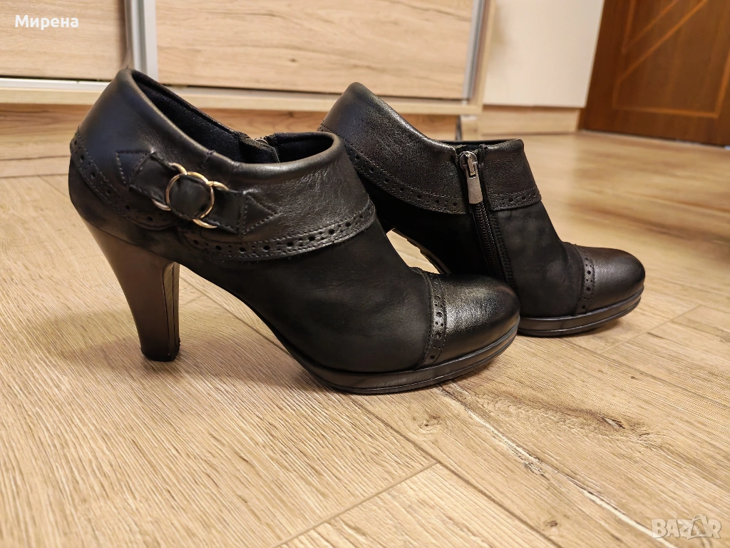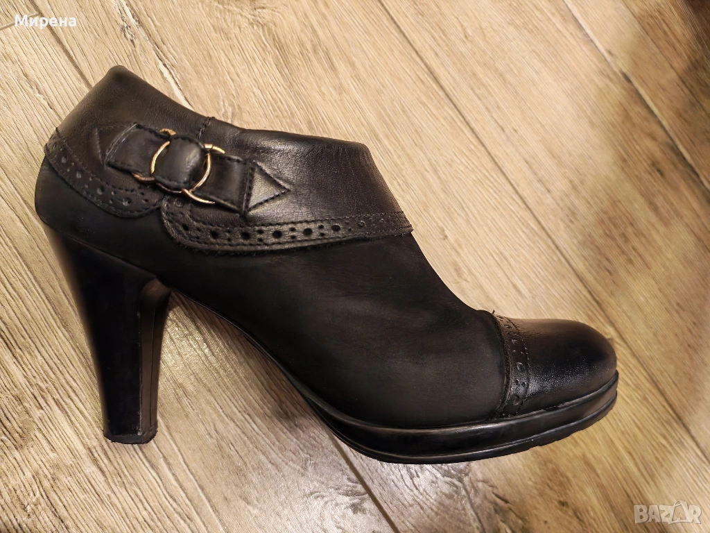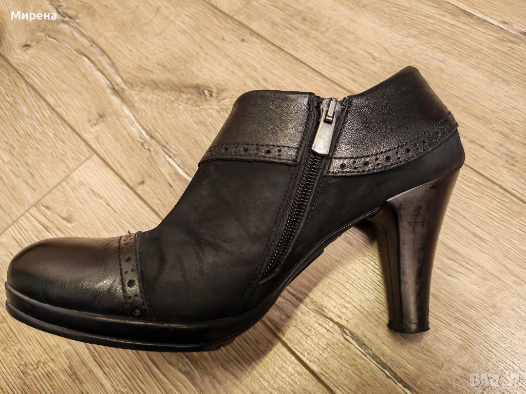 Черни обувки от естествена кожа и набук, номер 38, без забележки. Закупени от магазин Christian във Варна, носени, но запазени. Височина на тока 9 см, а на подметката отпред - 1.5 см. С мека стелка и подплатени отвътре, подходящи за по-хладно време. Подходящи за тесен крак. За гр. Варна може лично предаване.