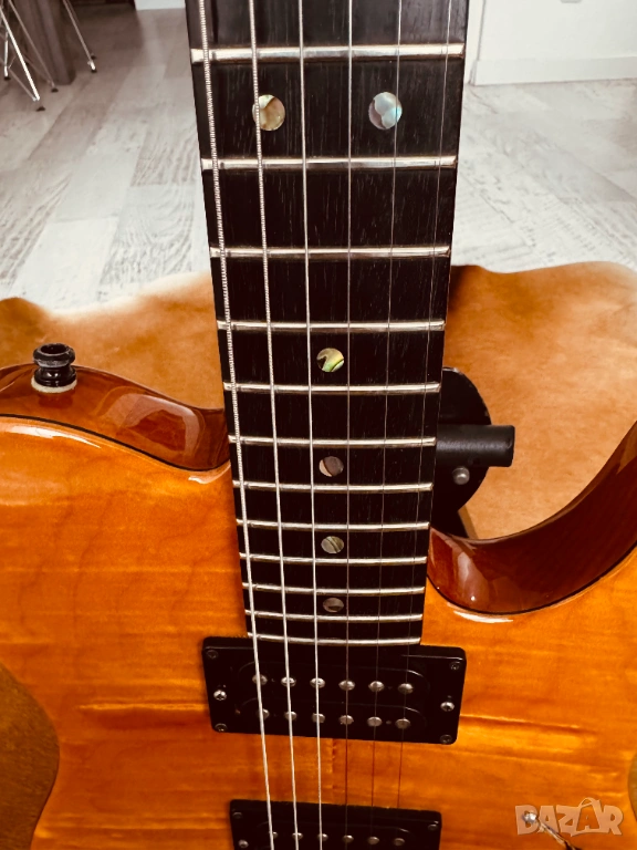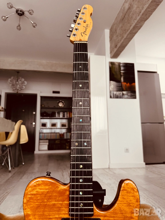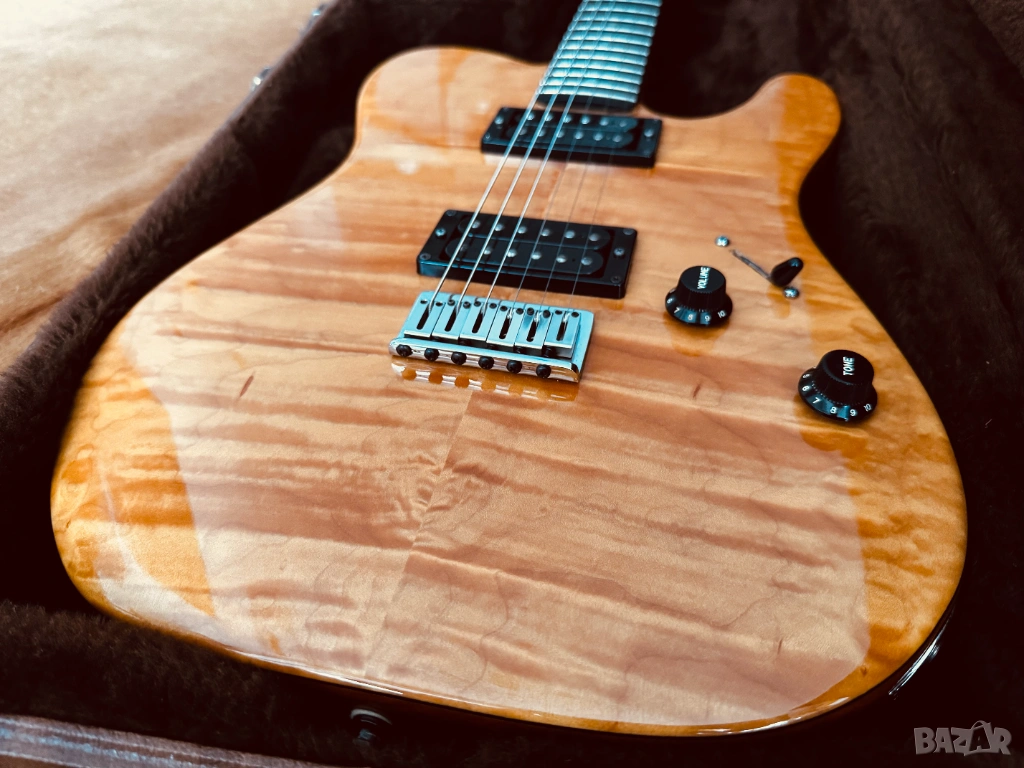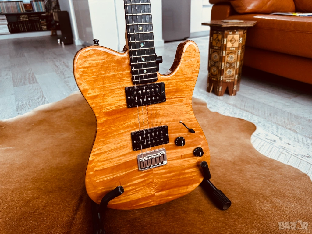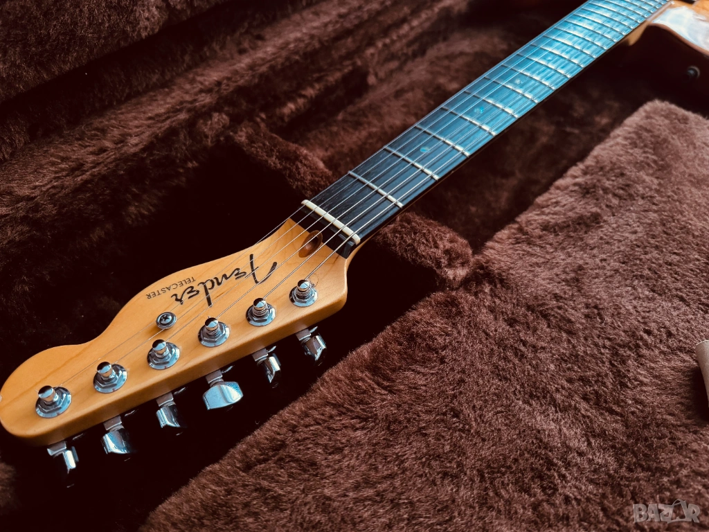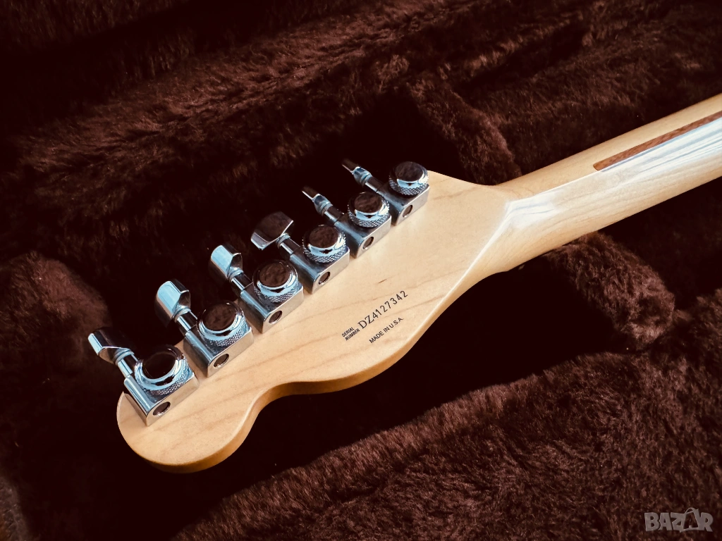 Продава се електрическа китара Fender American Deluxe Telecaster QMT (Quilt Maple Top), Made in USA, от 2004 г., със сериен номер DZ4127342. Тялото е от цяло парче елша, с 5A изключително красив кленов топ. Грифът е от цяло парче клен, с изключително рядката опция за абаносов фингърборд; радиус 9.5", Modern C Shape, Jumbo прагове в ТОП състояние, заключващи ключове и костен нът. Адаптерите са два хъмбъкера Fender Enforcer, Made in USA, които могат да се сплитват и звучат уникално. 1 x Volume 500k, 1 x Tone 500k и 5-степенен ключ. Оригиналните капачки за потенциометрите са заменени с фендерските от снимките, като оригиналните са с китарата. В оригиналния Made in USA, G&G Hard Case, са пълният набор от документи и аксесоари, които идват при покупка на китарата, както и оригиналният Fender колан със заключване. Китарата е сетната с Ernie Ball, Made in USA, Hybrid Slinky 0.09 - 0.46 струни, с перфектна интонация, стабилност и удобство на свирене. Инструментът е подходящ за абсолютни всички стилове, с изключително плътен и красив тон, с изобилие от обертонове, ясен, пробивен и чист. Качеството на изработка е на ниво Custom Shop, безапелационно и възхитително. Може да се тества в гр. Варна. БЕЗ БАРТЕРИ.
