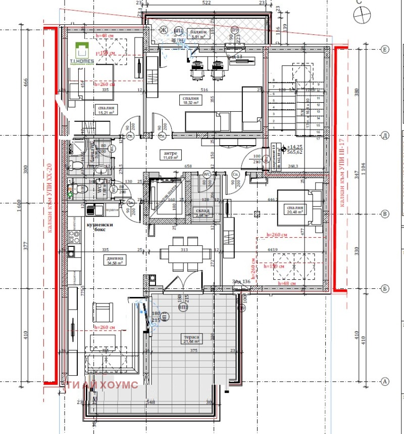 Разпределение: Голяма и просторна кухня с всекидневна (35м2) на юг, две спални едната с балкон на север 15м2 и 18м2, трета спалня на югоизток 20 м2. ЗП. 140 м2 и 23 м2 южна тераса.