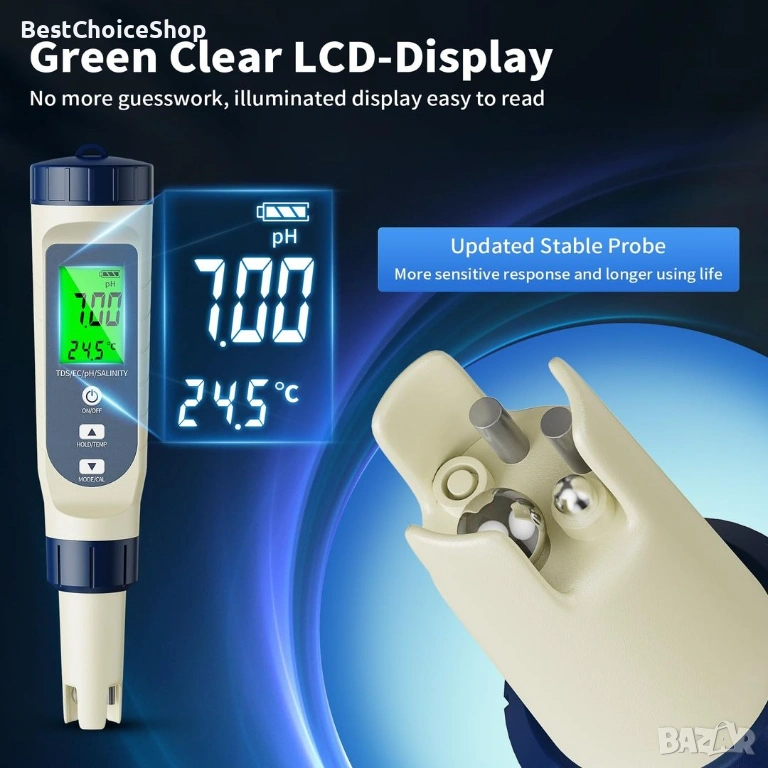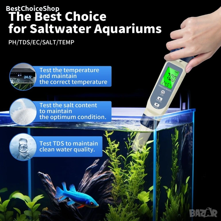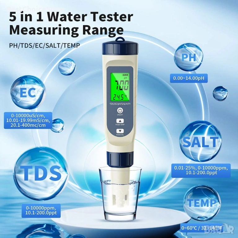YAOBLUESEA 5 в 1 тестер за вода в басейн, pH метър, тестер за качество на водата с цифров дисплей, TDS/EC/соленост/температура/pH тестер, за питейна вода, басейн, аквариуми, хидропоника
