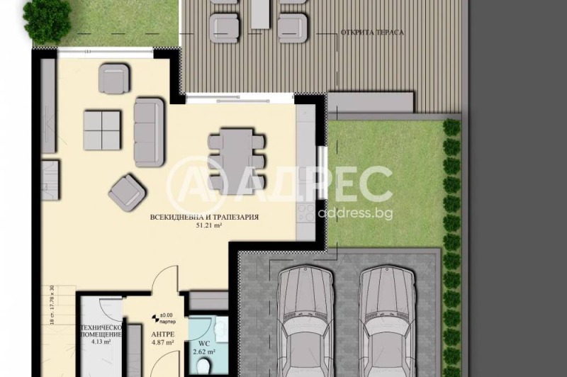 първи етаж разполага, просторна дневна с трапезария и кухненски бокс от която се излиза на открита тераса/веранда на нивото на двора, тоалетна, техническо помещение, склад и стълбище;