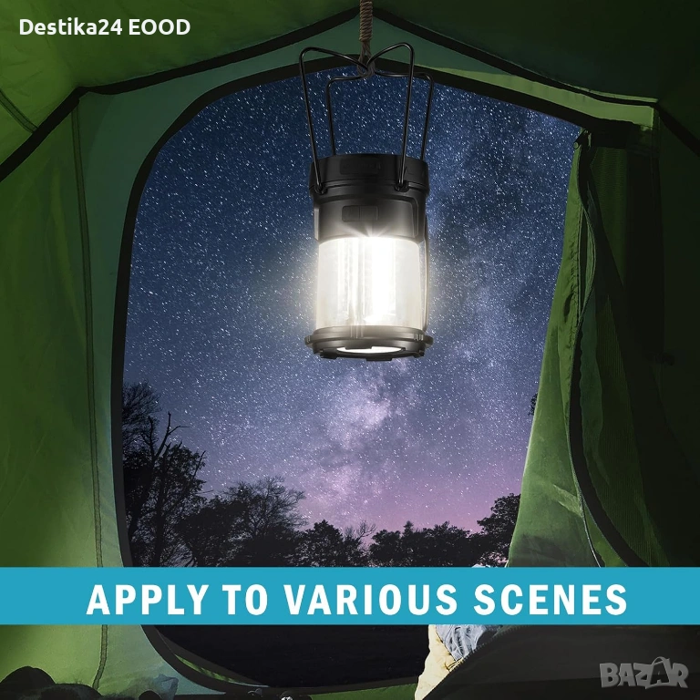 Продавам мултифункционална соларна къмпинг лампа ELUTENG, подходяща за къмпинг, туризъм, риболов, аварийни ситуации и спиране на тока. Компактна, сгъваема и практична, с вградена батерия и функция Power Bank.