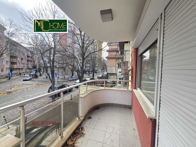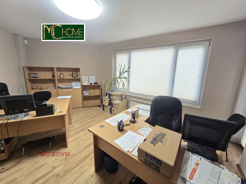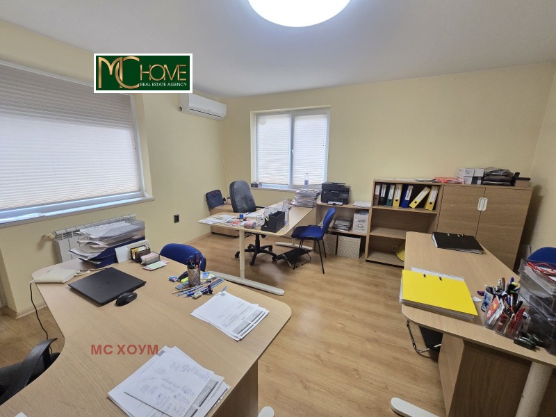 Помещението е с площ 120 кв.м. на първи етаж над магазини. Има на разположение три работни помещения, два санитарни възела, кухня, две тераси и голям коридор, подходящ за рецепция, с обособена висока секция за съхранение на документи.