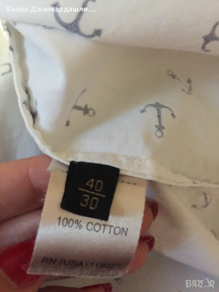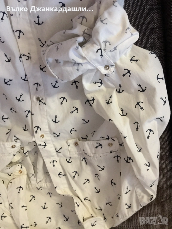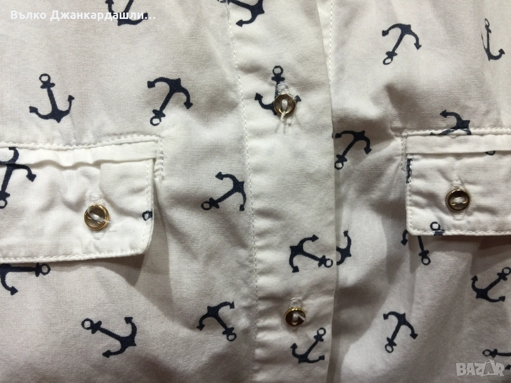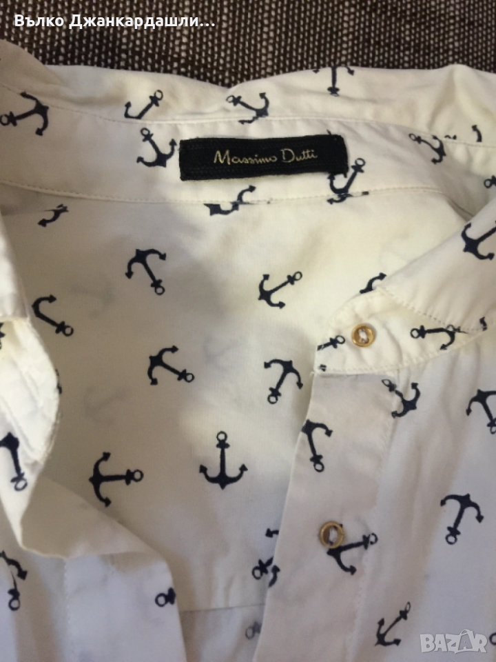 Дамска риза на Massimo Dutti с морски десен, тъмносини котви. С малки деликатни копчета, с възможност ръкавът да се навива и да се носи като три четвърт.