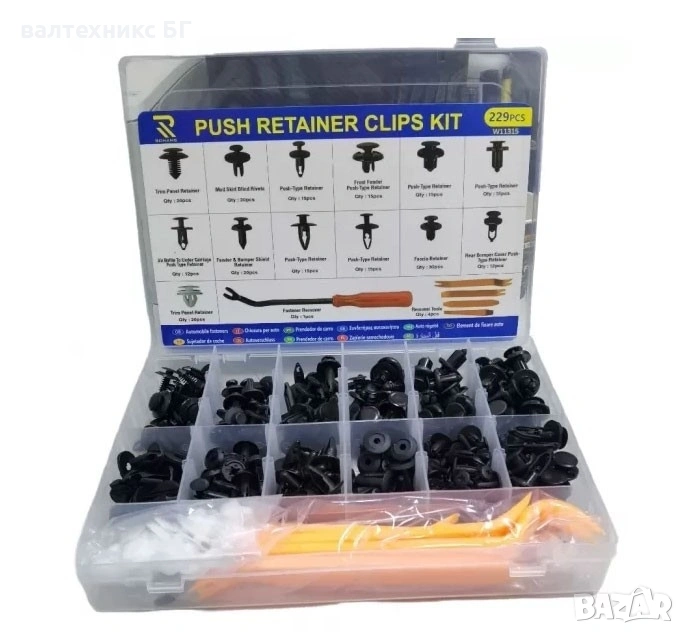 Комплектът има 13 вида фиксатори и държачи за калник и броня.