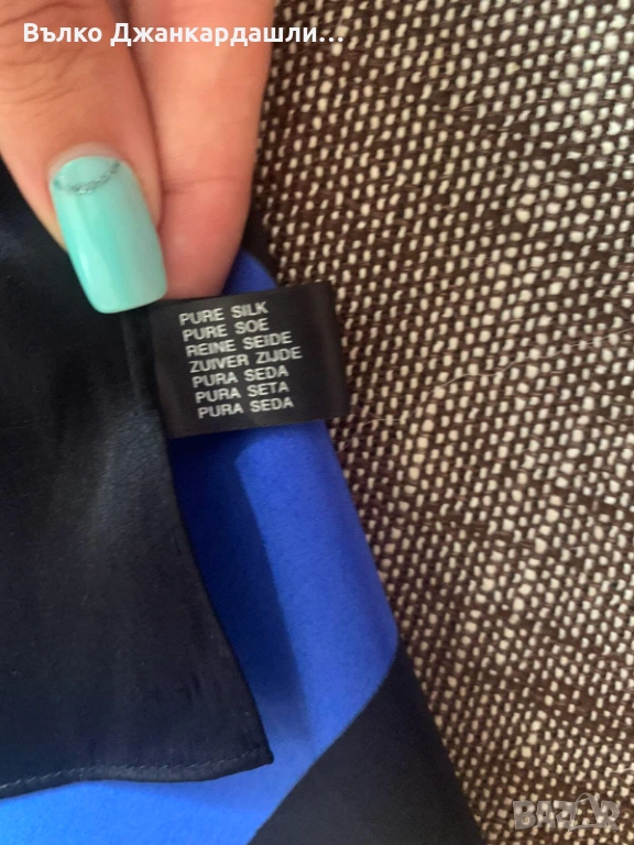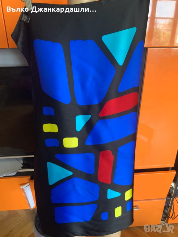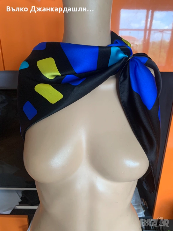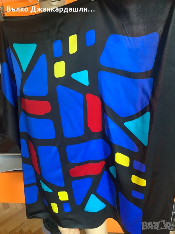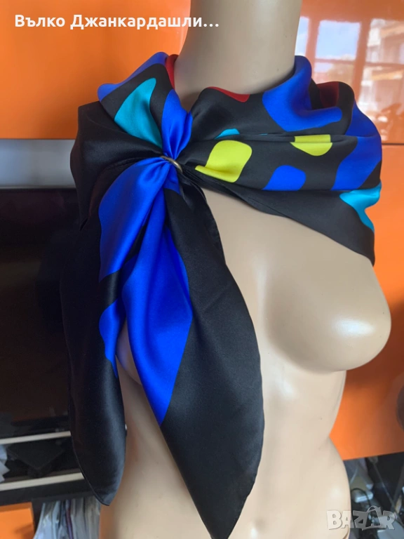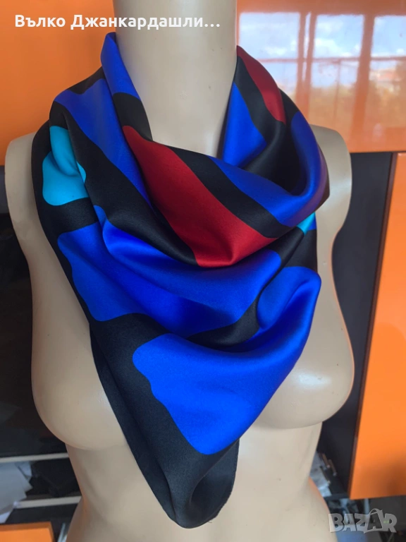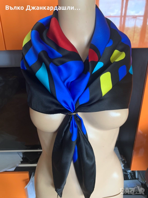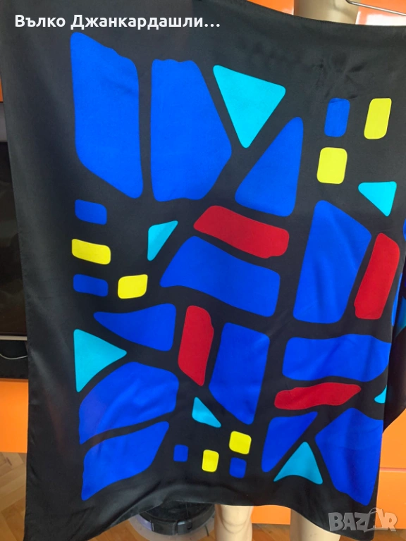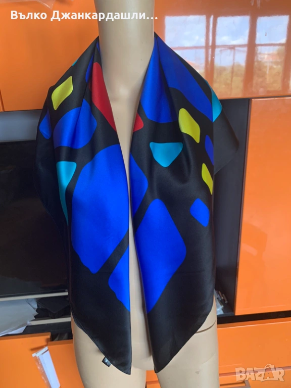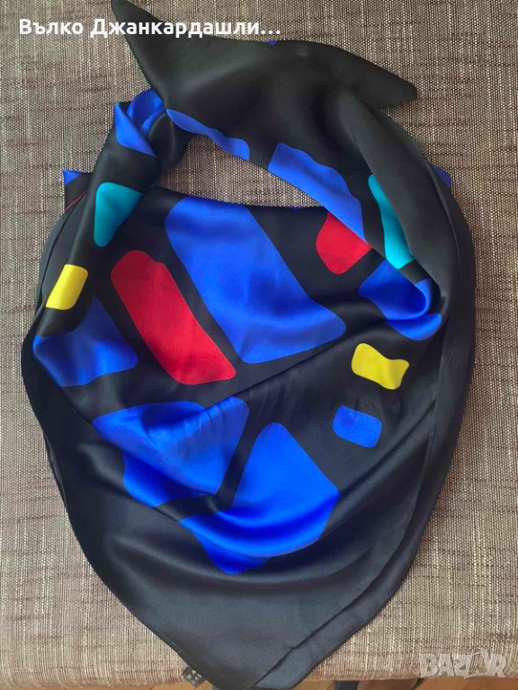 Голям копринен шал на геометрични фигури. На черен фон са разпръснати геометрични фигури в наситени тонове- тъмносиньо, червено, жълто.Разнообразието от пъстри и ярки цветове го прави съчетаем с много тоналности- на турско синя, жълта, червена рокля, риза, сако. Ефектът му се подчертава още по-силно в комбинация с друг аксесоар в един от цветовете му- като например обувки, обици, чанта.