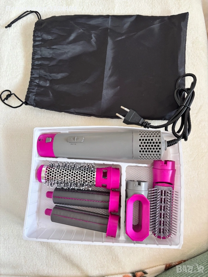 Четка за коса с горещ въздух с 5 приставки. Подходяща за стилизиране на косата у дома- сушене, изправяне, къдрене, придаване на обем и оформяне на косата.