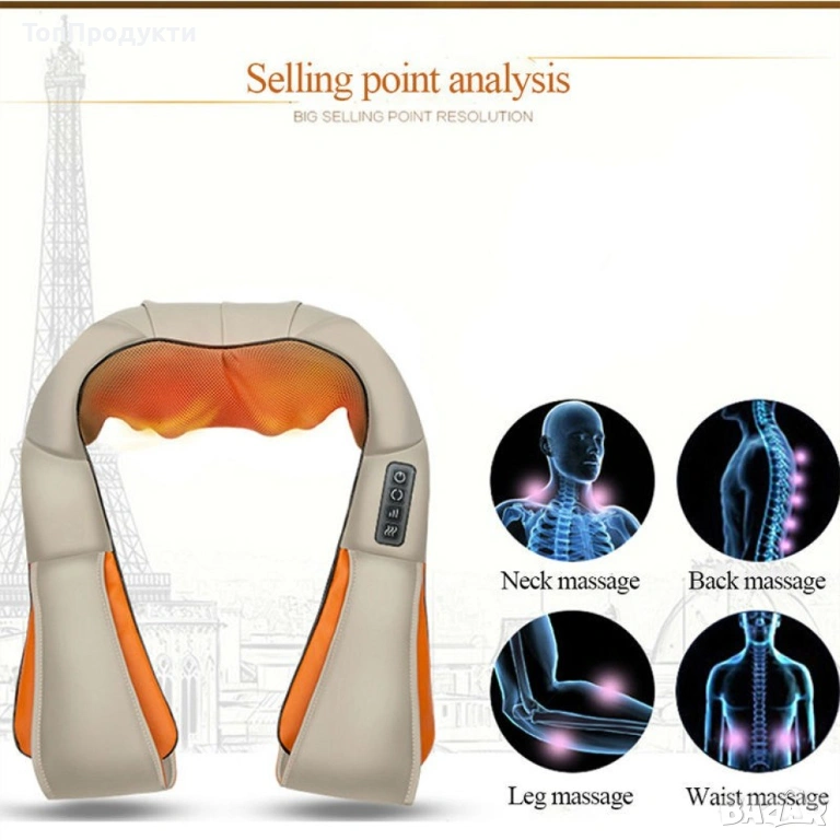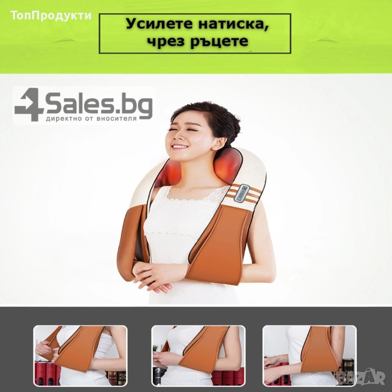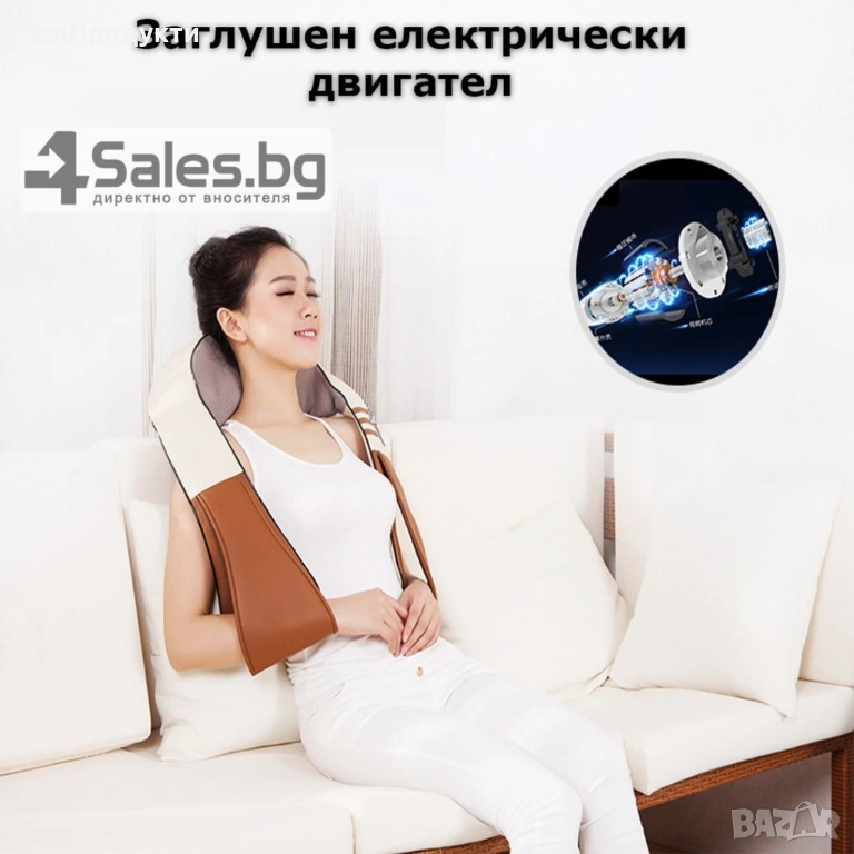 Шиацу масажор за врат и гръб / Размер опаковка: 41 х 17х 53 см; Дължина на продукта: 125 см; Ширина на активната част: 22 см; Височина на активната част: 18 см; Материал: Еко кожа, полиестер; Мощност: 25 W; Захранване: 12 V; Тегло: 1.5 кг; Честота: 50 Hz; Ниво на шум: 45 dB; Екстри: Контрол панел, степени, загряване, посока на масажиране.