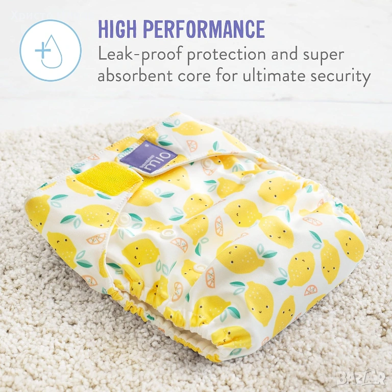 • Изработен от 100% полиестер, ламиниран с полиуретан, вътрешна част: 100% полиестер, сърцевина: 85% полиестер, 15% найлон. Изперете преди употреба. Перете в пералня с небио препарат до 60°C. Не използвайте омекотител за тъкани. Не използвайте хлорна белина. За да по-ефективно пране, добавете капка бебешки препарат за пране Bambino Mio's към прането си. Сушете на въздух, далеч от пряка топлина. Може да се суши в сушилня на студена/ниска степен. Не подлагайте на химическо чистене. Не гладете. Бъдете внимателни към пелените си – за да извлечете максимума от тях, перете на по-ниски температури. Прането на по-високи температури и честото сушене в сушилня може да доведе до преждевременно износване на пелените ви. *Вярно за повечето бебета, но поради широката гама от форми и размери това не може да бъде гарантирано. Цветовете и дизайните може да варират.