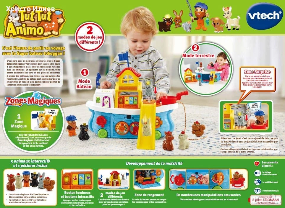 Нека плаваме заедно с нашите приятели животни! Намерете приятели с животни и се насладете на 2 начина да играете с лодката Animal Friends Boat от VTech! Животните ще ви поканят да играете заедно на лодката или в къщата. Плъзнете животните по пързалката за повече забавление!