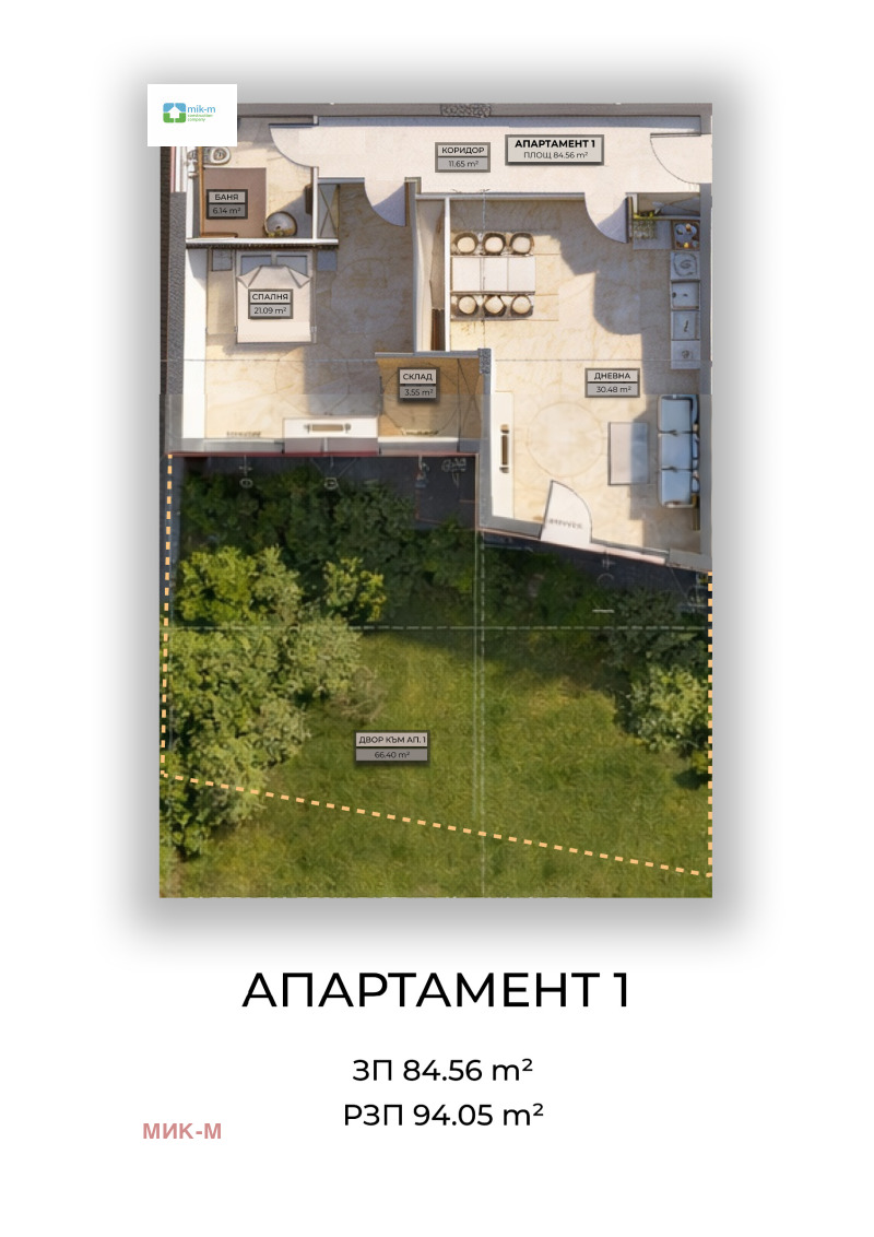 Двустаен ап. 1 на 1-ви етаж със застроена площ 84,56кв.м., с общи части 94,05кв.м.
