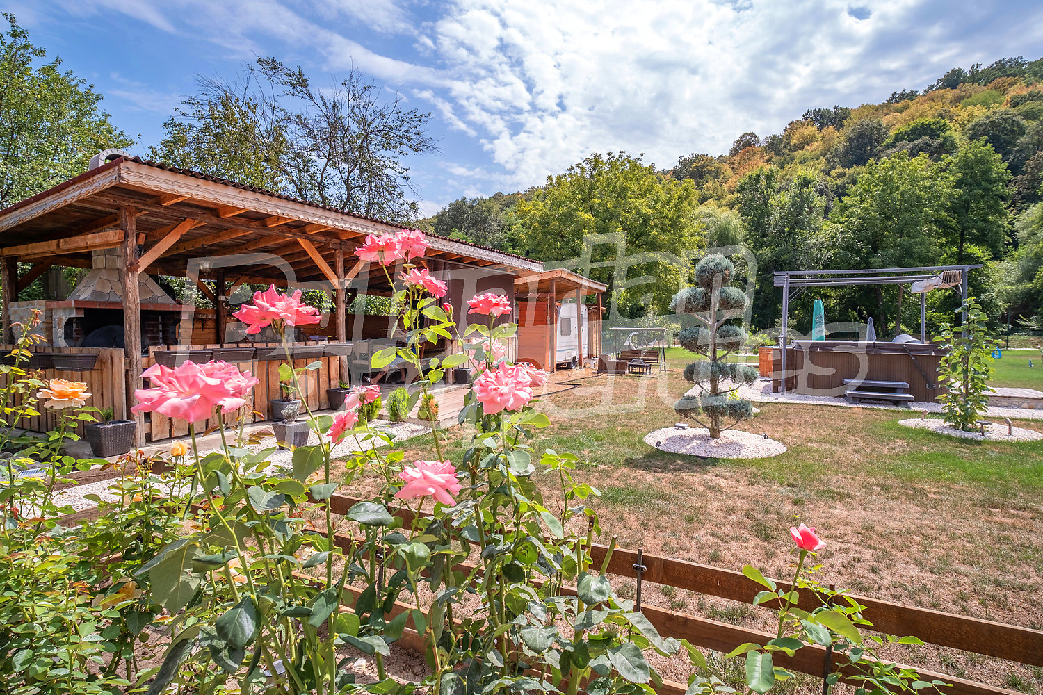 Лятна кухня с барбекю и покрит кът за гости (дървен навес)