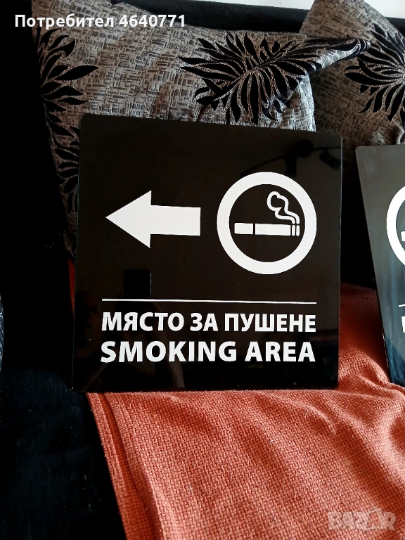Три броя указателни табели за място за пушене. Бял надпис ня черно стъкло, 40х40см.