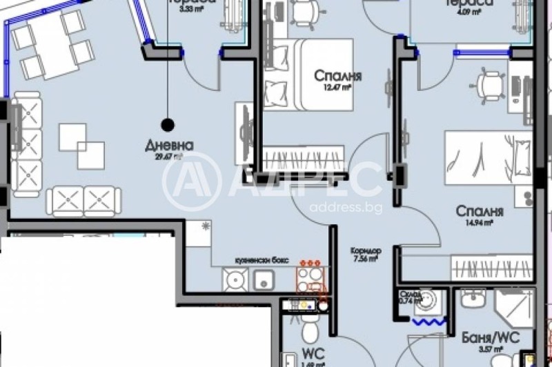 Площ на имота 104,41 кв. м., етаж 6 от 9, асансьор. Разпределение: дневна с кухненски кът и спалня с обща тераса, втора спалня с тераса, баня с тоалетна и отделно тоалетна и складово помещение. Апартаментът ще бъде завършен 'на тапа''. Към всеки имот може да бъде закупен ГАРАЖ от 26 000 до 38 000 евро.