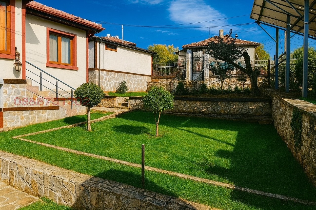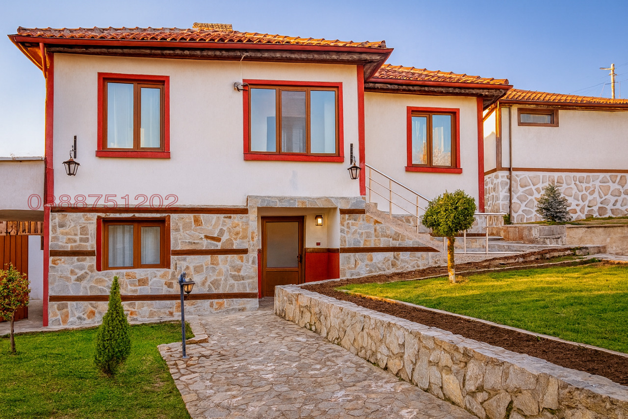 Първи етаж, голяма механа в модерен стил, спалня с две легла, антре, помещение за съхранение на пелети, баня и тоалетна. Къщата е след ремонт 2024 г., сменена ел. и ВИК инсталация, изцяло. Подово отопление на втори етаж. Нови мебели, нови врати на първи и втори етаж, нова кухня на първи етаж с вградени уреди Bosh. Общо 6 стаи. Голям двор - 790 кв.м. 24 часа видеонаблюдение. Високоскоростен интернет. Голямо барбекю. В двора има изградена работеща фотоволтаична централа, генерираща ежемесечен добър приход. Къщата се намира в центъра на града. Подходяща за туризъм и отдаване за нощувки.