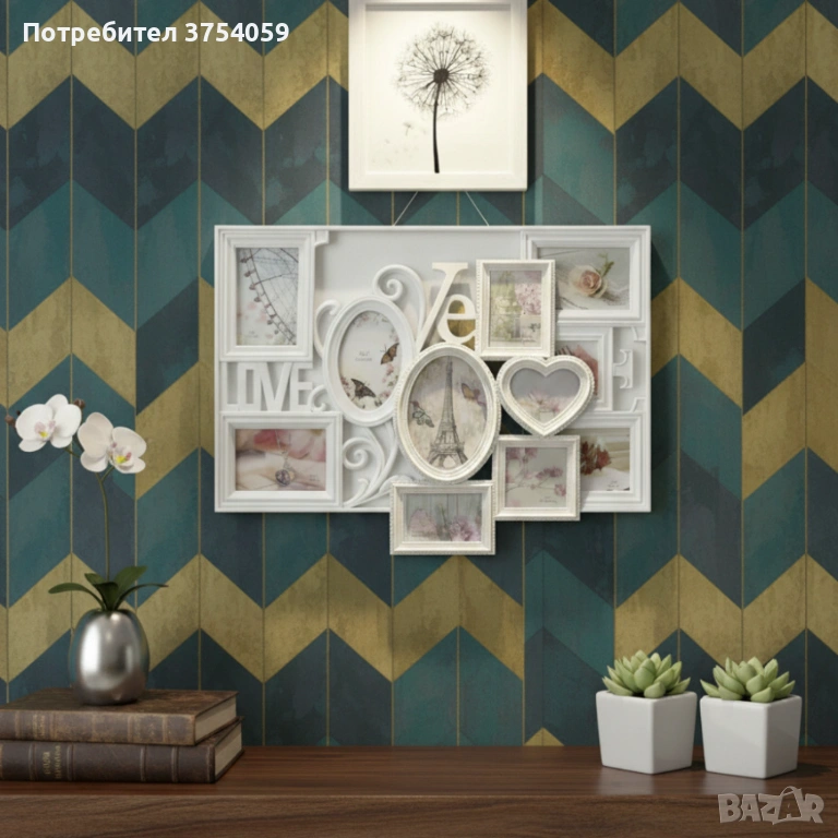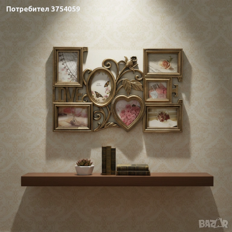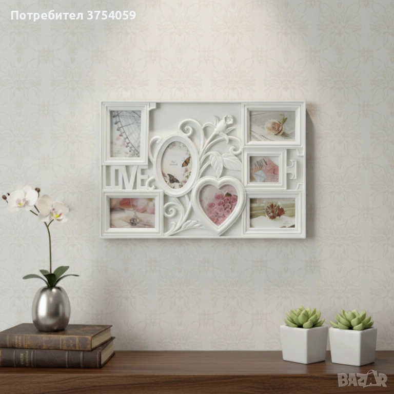 Снимките ти са разпръснати, а у дома липсва романтичен акцент? Многорамковата фоторамка Love (61×40,5 см) събира до седем снимки в различни форми – овал, сърце, правоъгълник – и ги обединява под надписа „Love“. Елегантният декоративен елемент с листа и роза подчертава темата, а изборът между бяло и антично бронзово позволява да се впише в различни интериори. Изработена от здрава пластмаса със стъклени панели, рамката се монтира лесно на стена, снимките се сменят без усилие и остават защитени от прах. Няма нужда от множество отделни рамки – получаваш цялостна композиция с един монтаж. Тя съчетава практичност и емоция, превръщайки се в акцент във всяка стая. Така подреждаш спомените си, освежаваш дома и имаш прекрасен подарък за близки.