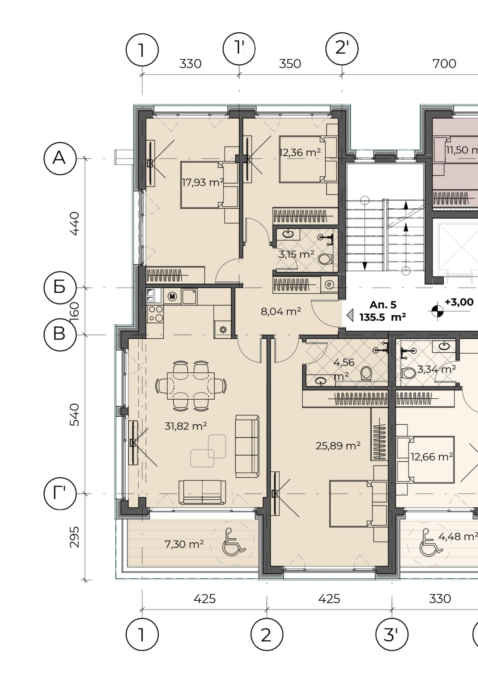 Обявената цена е за ЧЕТИРИСТАЕН апартамент, състоящ се от входно антре, дневна с кухненски бокс и трапезария, родителска спалня с гардероб и баня с WC, две спални, втора баня с тоалетна и тераса, находящ се на 2-ри жилищен етаж с кота +3,00 м. в Сграда ALTEA 3 - АПАРТАМЕНТ 05 от чертежите - ЗП - 135,52 кв.м.; ОЗП - 160,57 кв.м.;