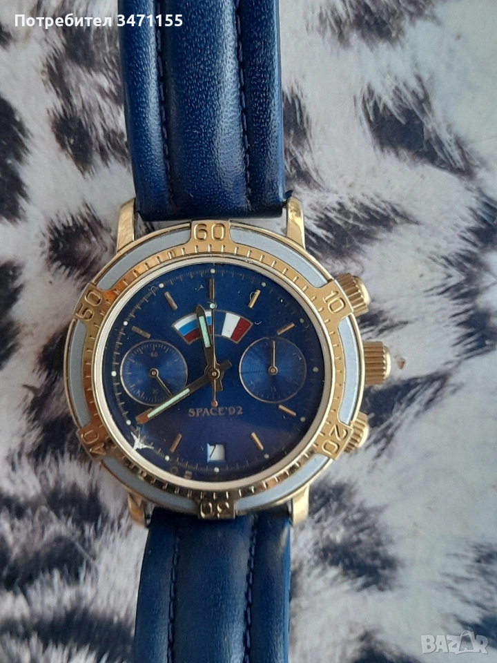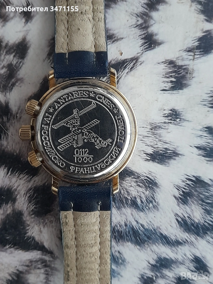 Лимитиран 112 от 1000 руски хронограф Poljot Космос.По случай руско-френския астрономически полет от 1992 год.Работещт с лека пукнатина между 7 и 8 часа.Възможно договаряне.