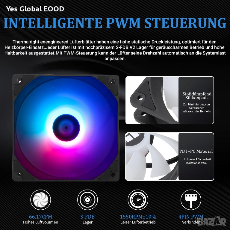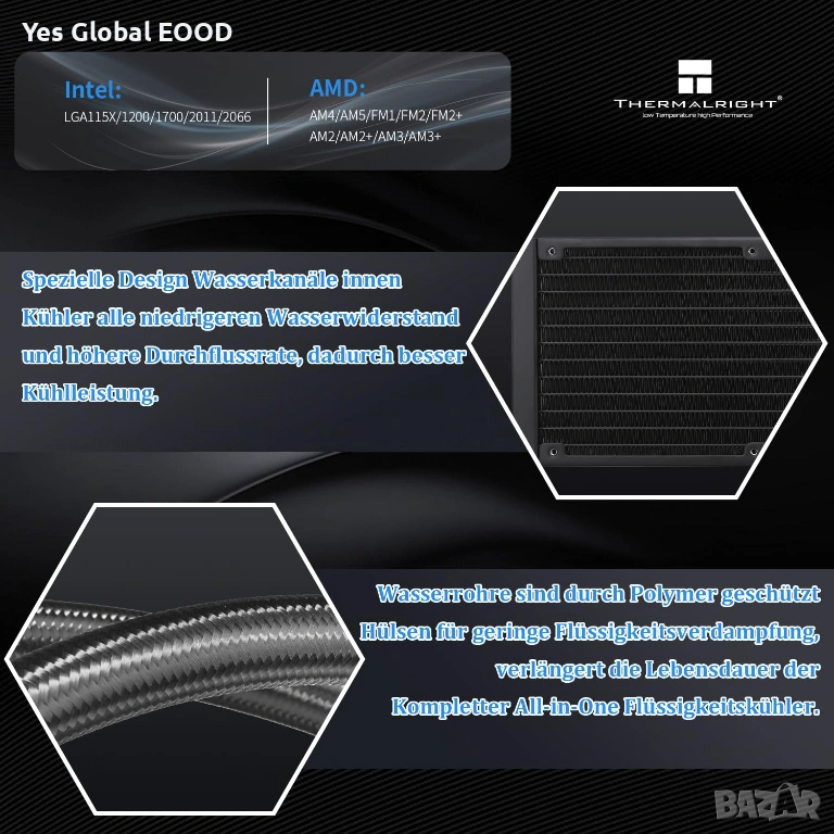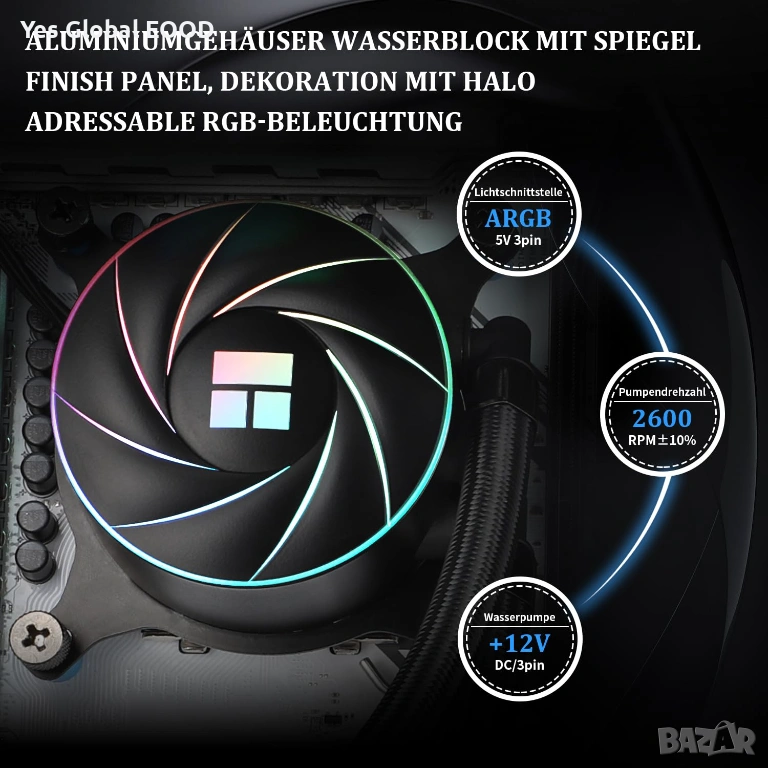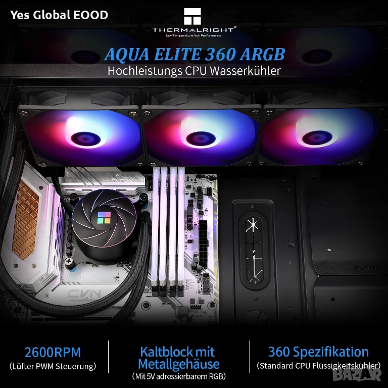 Thermalright Aqua Elite 360 ARGB е AIO система за водно охлаждане на процесори, предназначена за надеждно и ефективно охлаждане на настолни компютри. Охладителят разполага с 360 мм радиатор и три 120 мм PWM вентилатора с максимална скорост до 1550 оборота в минута, които осигуряват стабилен въздушен поток и тиха работа. ARGB осветлението допринася за модерен външен вид и персонализация на системата.