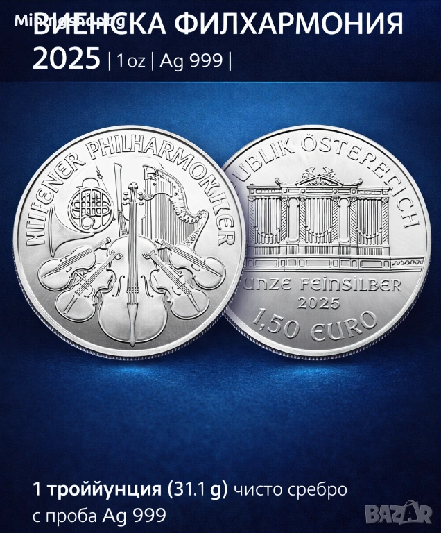 Сребърна монета ВИЕНСКА ФИЛХАРМОНИЯ 2025 1 oz | Ag 999 | → Обява 53153701
