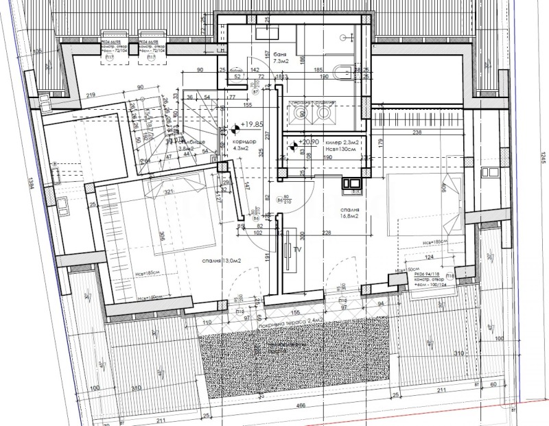 2 ниво: баня с тоалет, две спални и тераса;