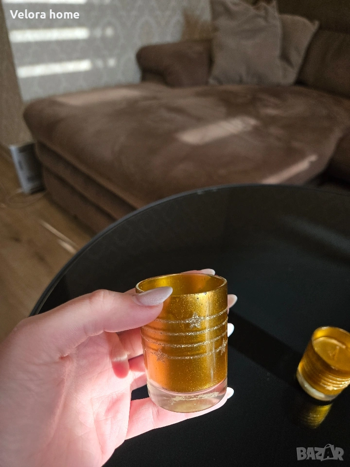 Продавам стилен стъклен свещник в златист цвят, който създава топла и уютна атмосфера. Подходящ за декорация на хол, спалня, маса за гости или специални поводи.