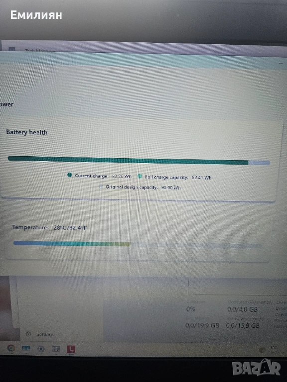 Батерия - 90Wh в много добро състояние. Издържа 5-6 часа в режим на web browsing и youtube (разбирa се при силно натоварване времето намалява)