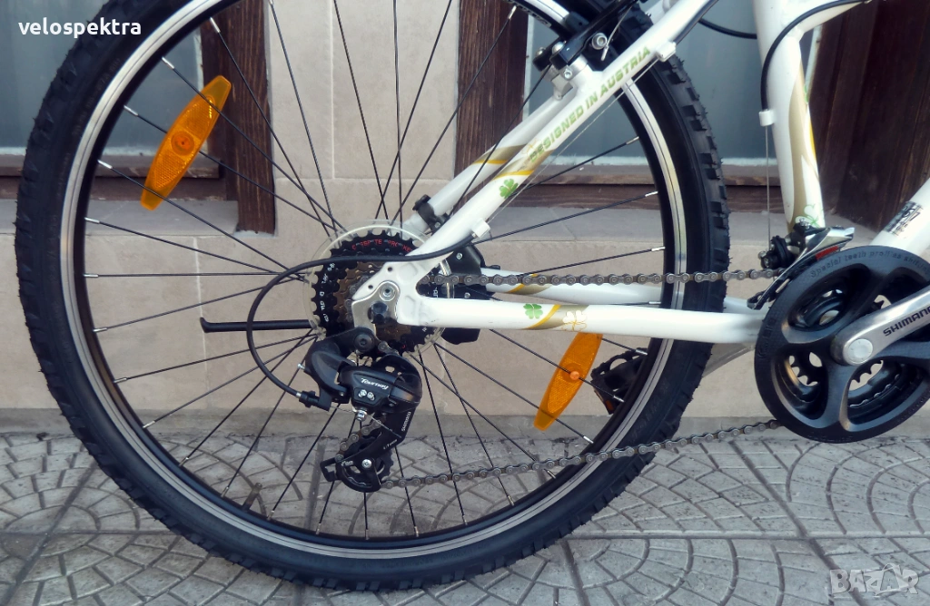 21 скорости Шимано Търней, палцови команди 3х7 Шимано с дисплей. Две вибрейк спирачки.