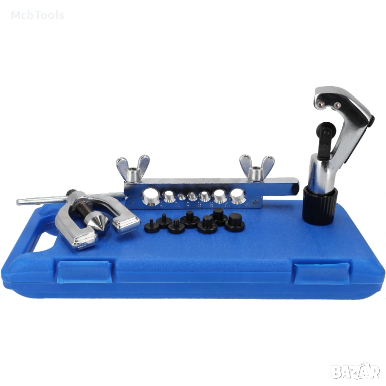 Конусната дъска осигурява прецизно и равномерно разширяване под ъгъл 45°, което гарантира надеждно и плътно съединение на тръбите. Комплектът включва различни адаптери, съвместими с най-често използваните размери тръби, както и резачка за чисто и точно отрязване.