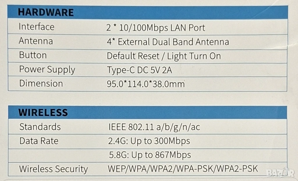 Висока скорост: Комбинирана скорост до 1200 Mbps (300 Mbps на 2.4G + 867 Mbps на 5.8G).