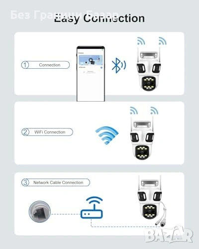 Тройна система с 3 обектива за пълно 360° покритие без „слепи зони“