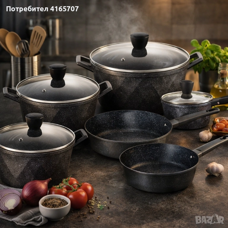 Премиум комплект съдове за готвене 12 части с мраморно покритие Cheffinger– Тенджери, тигани и касер → Обява 53155661
