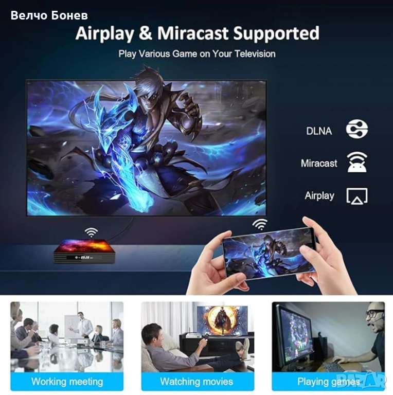 TV боксът е подходящ за гледане на филми и сериали, стрийминг платформи, YouTube, IPTV приложения, както и за инсталиране на различни Android приложения и игри.