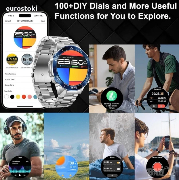 100+ циферблати и енкодер. За разлика от други часовници, смарт часовникът има три бутона за енкодер, които могат да постигнат функцията с една стъпка, удобно и бързо. Оборудван с над 100 деликатни циферблата, можете също да персонализирате циферблата към вашия фитнес смарт часовник. Можете също така да възпроизвеждате музика, да правите снимки и др. чрез гласов асистент, което прави ежедневните сценарии, където е неудобно да държите мобилен телефон (например шофиране), по-конкретни и интелигентни.