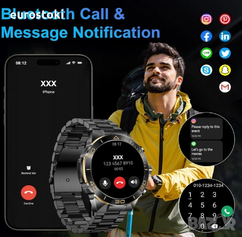 Bluetooth напомняне за обаждания и съобщения. Спортният часовникът за мъже поддържа осъществяване и получаване на напомняния за обаждания и съобщения. Вграден HD високоговорител и микрофон, можете да осъществявате и приемате обаждания по всяко време след свързване чрез Bluetooth. Синхронизирайте информацията от приложението на мобилния си телефон. Така че, независимо дали тренирате, шофирате или си чатите на парти, никога няма да пропуснете важни обаждания и съобщения.