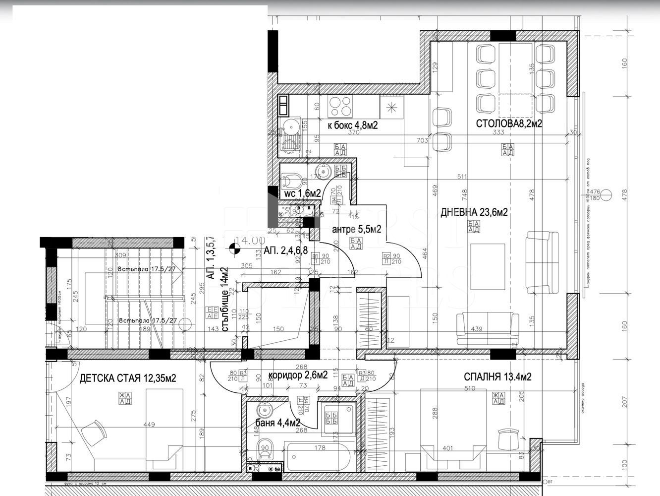 Разпределение върху 92 м2 чиста застроена площ: