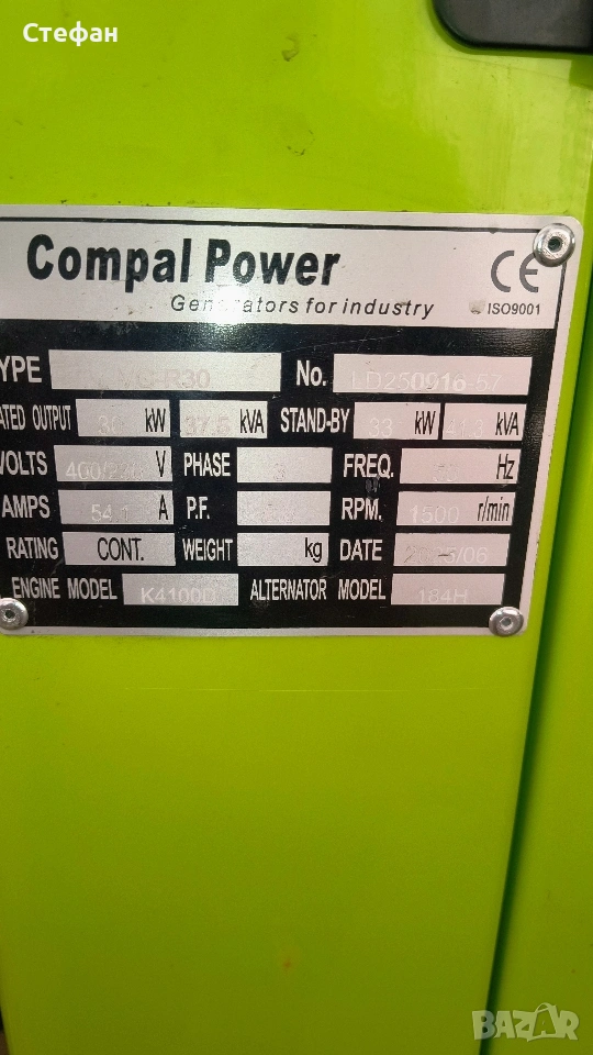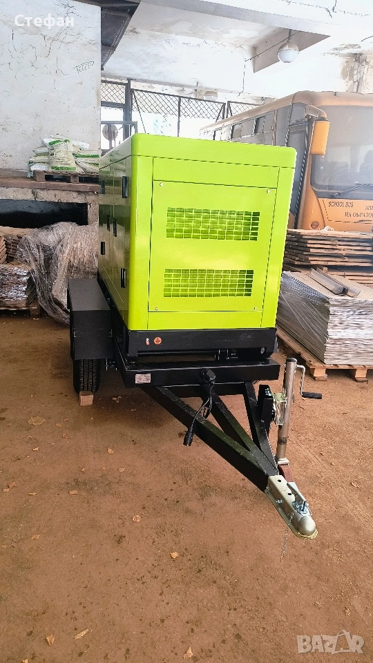 Продавам чисто нов трифазен дизелов генератор Compal Power 30kW - 41,3kVA в комплект с ремарке. Обслужен и готов за работа! 4 цилиндров двигател Ricardo с водно охлаждане, серия "Silent" - обезшумен. Размери 2000 х 1000 х 1200, тегло 900кг. Размери заедно с ремаркето 3300 х 1450 х 1700, общо тегло 1100кг. Гуми 165/70/13. Възможност за издаване на фактура по ДДС.