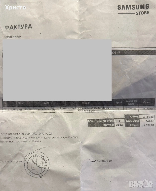 ползване с всички оператори. Закупен е през Април 2024 г. директно от Samsung Store София и разполага с остатъчна гаранция до април 2026 г., което може да се види по документите. Никога не е бил на сервиз и по него не е правено абсолютно нищо. Единствените забележки са леки козметични следи по външния (малкия) дисплей – без пукнатини, без счупвания и без да пречат по какъвто и да е начин на работата или видимостта. Продава се с оригиналната кутия, всички документи, кабел за зареждане и подарък гръбче. Без бартери!!!